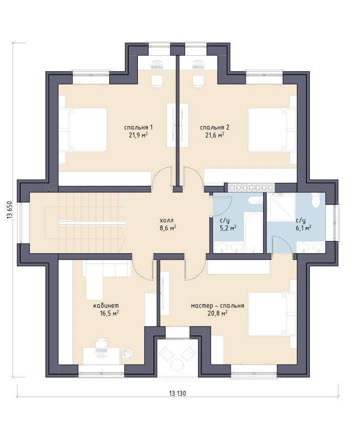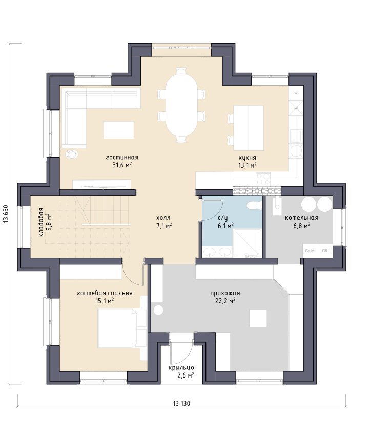 Современный дом из кирпича на свайном-ростверковом фундаменте. В проекте два полноценных этажа, большие окна и вальмовая крыша. Дом идеально подойдет для семьи с двумя-тремя детьми.